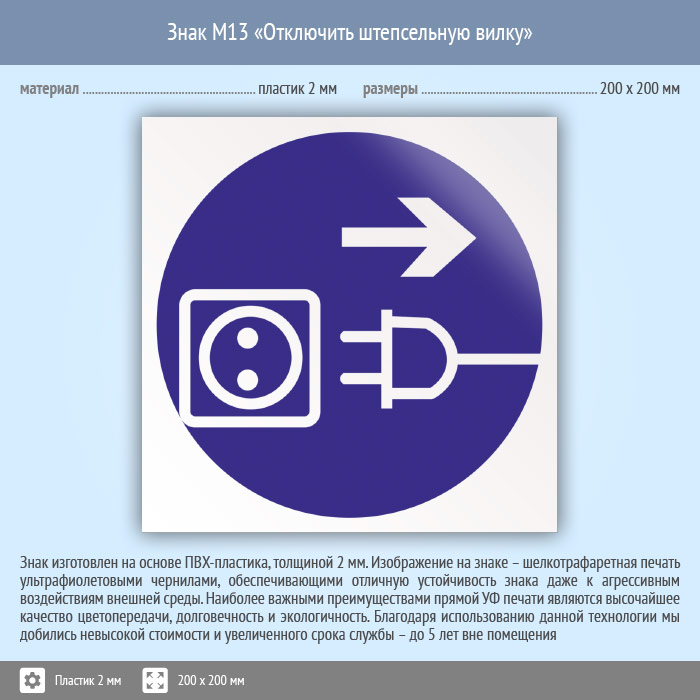 Знак M13 «Отключить штепсельную вилку» (пластик, 200х200 мм) в Кызыле купить