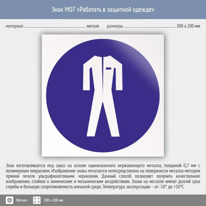 Знак M07 «Работать в защитной одежде» (металл, 200х200 мм) в Кызыле купить