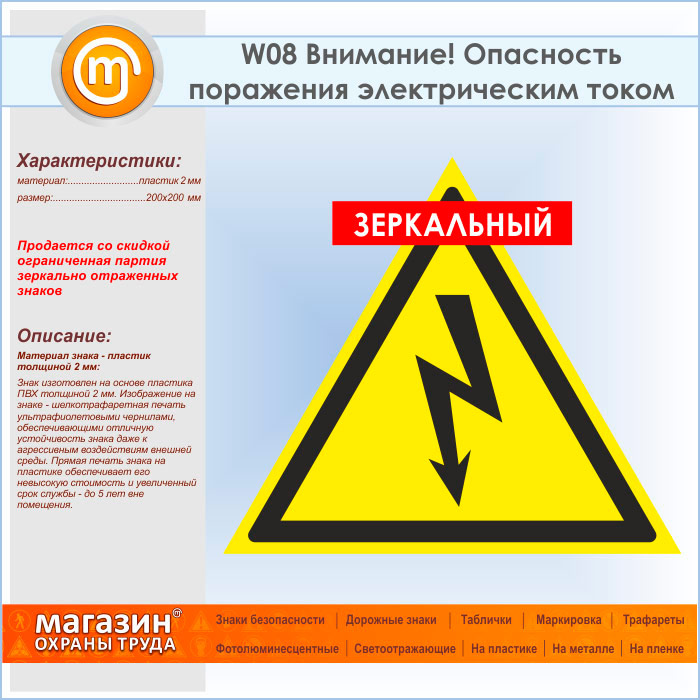 Знак W08 «Внимание! опасность поражения электрическим током» (пластик, сторона 200 мм) (знак зеркально отражен) в Кызыле купить