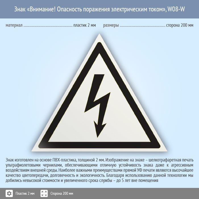 Знак W08-W «Внимание! опасность поражения электрическим током» (белый, пластик, сторона 200 мм) в Кызыле купить