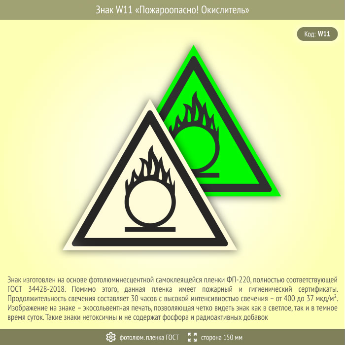 Знак W11 «Пожароопасно! окислитель» (фотолюминесцентная пленка ГОСТ 34428-2018, сторона 150 мм) в Кызыле купить