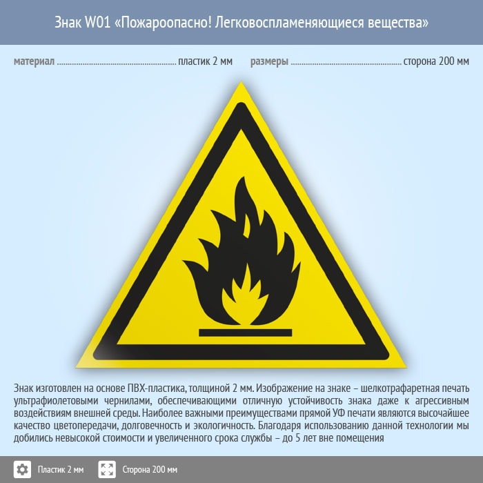 Знак W01 «Пожароопасно! легковоспламеняющиеся вещества» (пластик, сторона 200 мм) в Кызыле купить