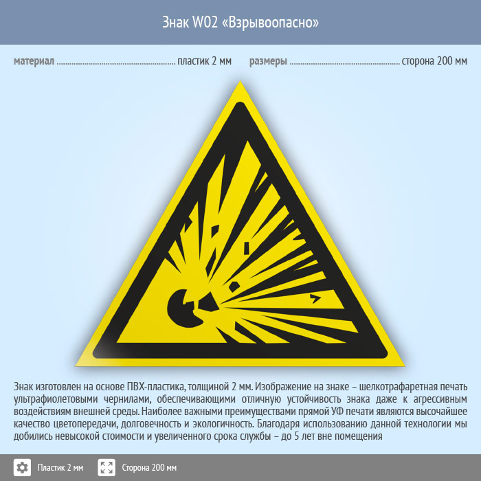 Знак W02 «Взрывоопасно» (пластик, сторона 200 мм) в Кызыле купить