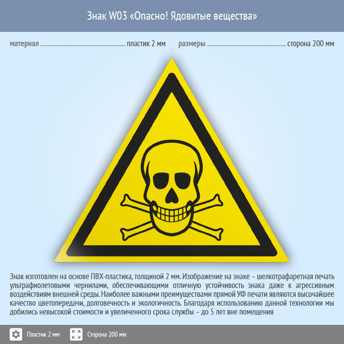 Знак W03 «Опасно! ядовитые вещества» (пластик, сторона 200 мм) в Кызыле купить