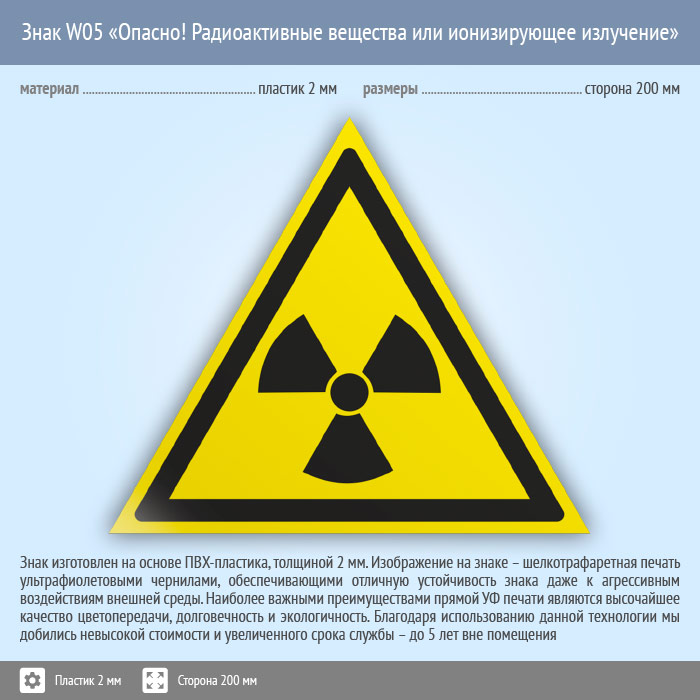 Знак W05 «Опасно! радиоактивные вещества или ионизирующее излучение» (пластик, сторона 200 мм) в Кызыле купить
