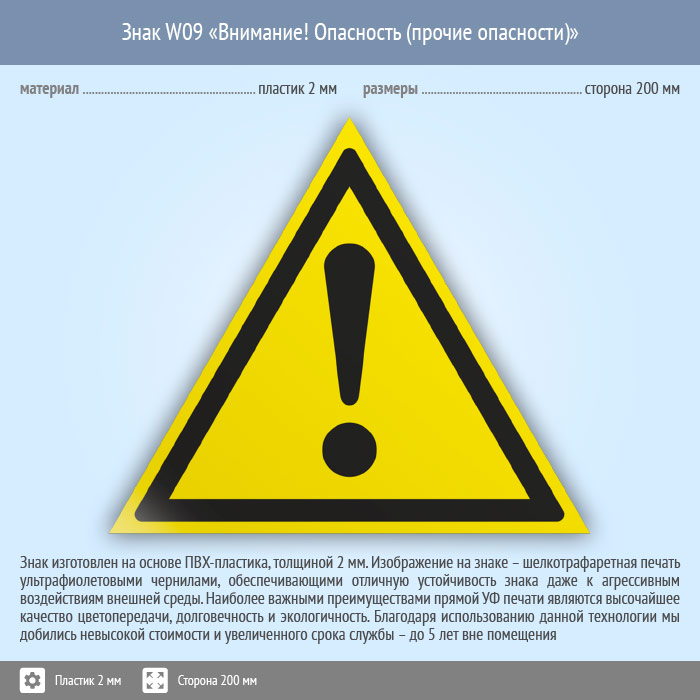 Знак W09 «Внимание! опасность (прочие опасности)» (пластик, сторона 200 мм) в Кызыле купить