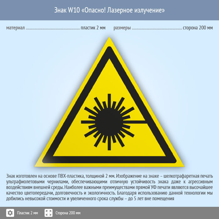 Знак W10 «Опасно! лазерное излучение» (пластик, сторона 200 мм) в Кызыле купить