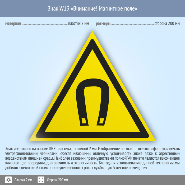 Знак W13 «Внимание! магнитное поле» (пластик, сторона 200 мм) в Кызыле купить