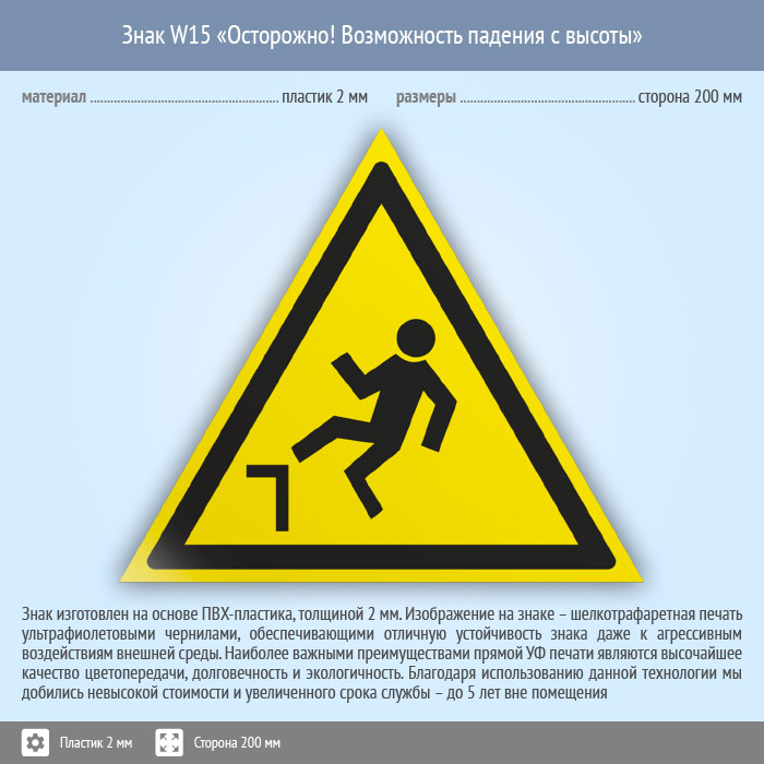 Знак W15 «Осторожно! возможность падения с высоты» (пластик, сторона 200 мм) в Кызыле купить