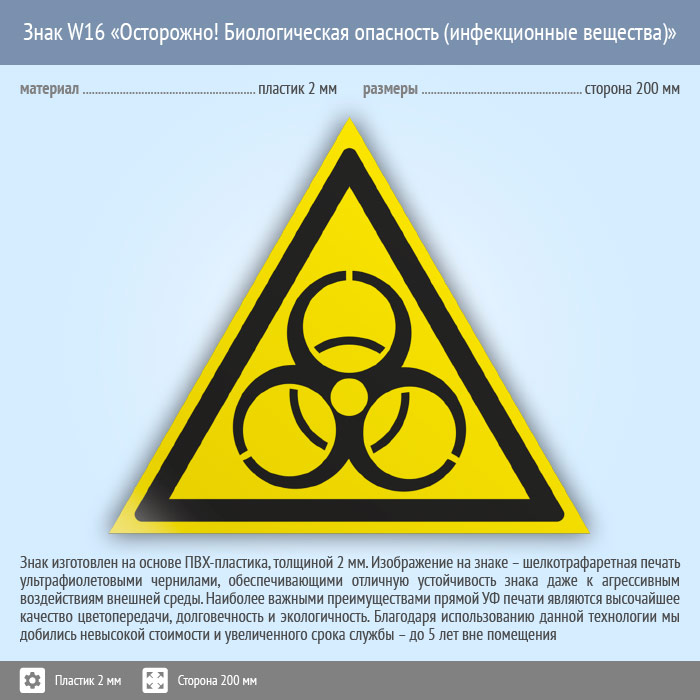 Знак W16 «Осторожно! биологическая опасность (инфекционные вещества)» (пластик, сторона 200 мм) в Кызыле купить