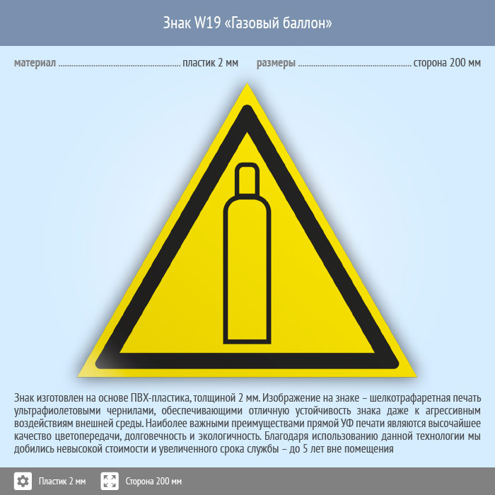 Знак W19 «Газовый баллон» (пластик, сторона 200 мм) в Кызыле купить