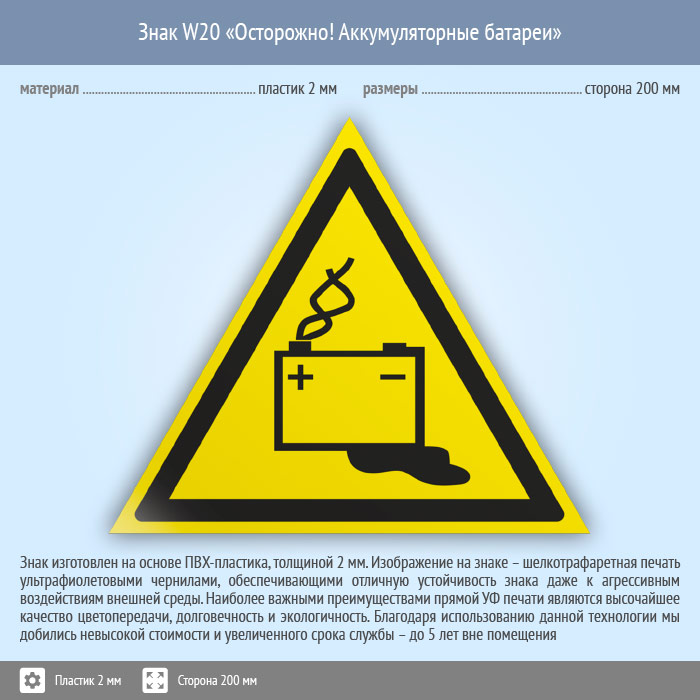 Знак W20 «Осторожно! аккумуляторные батареи» (пластик, сторона 200 мм) в Кызыле купить