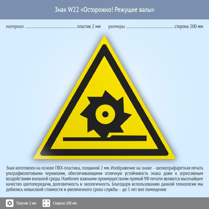 Знак W22 «Осторожно! режущие валы» (пластик, сторона 200 мм) в Кызыле купить