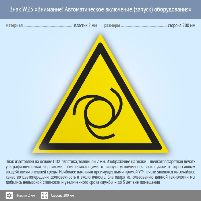 Знак W25 «Внимание! автоматическое включение (запуск) оборудования» (пластик, сторона 200 мм) в Кызыле купить
