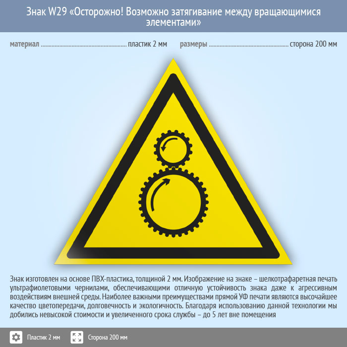 Знак W29 «Осторожно! возможно затягивание между вращающимися элементами» (пластик, сторона 200 мм) в Кызыле купить