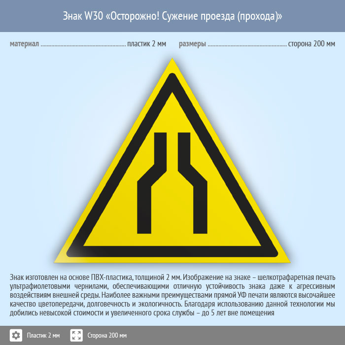 Знак W30 «Осторожно! сужение проезда (прохода)» (пластик, сторона 200 мм) в Кызыле купить