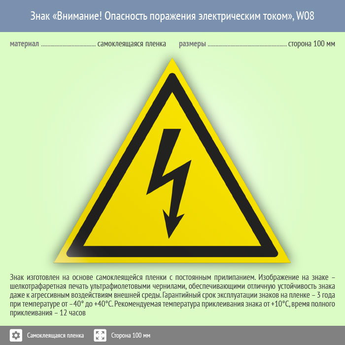Знак W08 «Внимание! опасность поражения электрическим током» (пленка, сторона 100 мм) в Кызыле купить