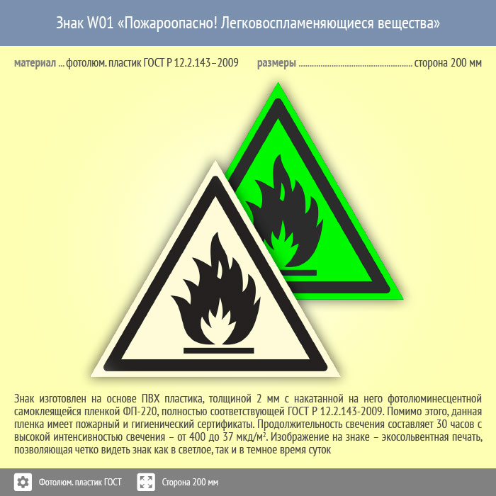 Знак W01 «Пожароопасно! Легковоспламеняющиеся вещества» (фотолюминесцентный пластик ГОСТ 34428-2018, сторона 200 мм) в Кызыле купить