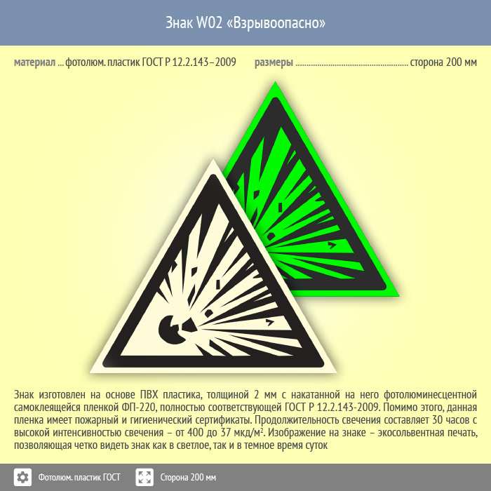 Знак W02 «Взрывоопасно» (фотолюминесцентный пластик ГОСТ 34428-2018, сторона 200 мм) в Кызыле купить