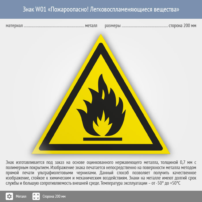 Знак W01 «Пожароопасно! легковоспламеняющиеся вещества» (металл, сторона 200 мм) в Кызыле купить