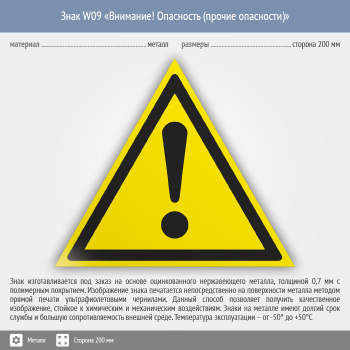 Знак W09 «Внимание! опасность (прочие опасности)» (металл, сторона 200 мм) в Кызыле купить