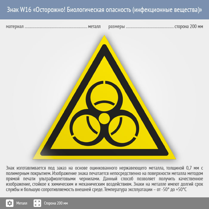 Знак W16 «Осторожно! биологическая опасность (инфекционные вещества)» (металл, сторона 200 мм) в Кызыле купить