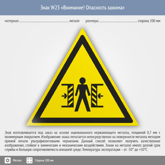 Знак W23 «Внимание! опасность зажима» (металл, сторона 200 мм) в Кызыле купить