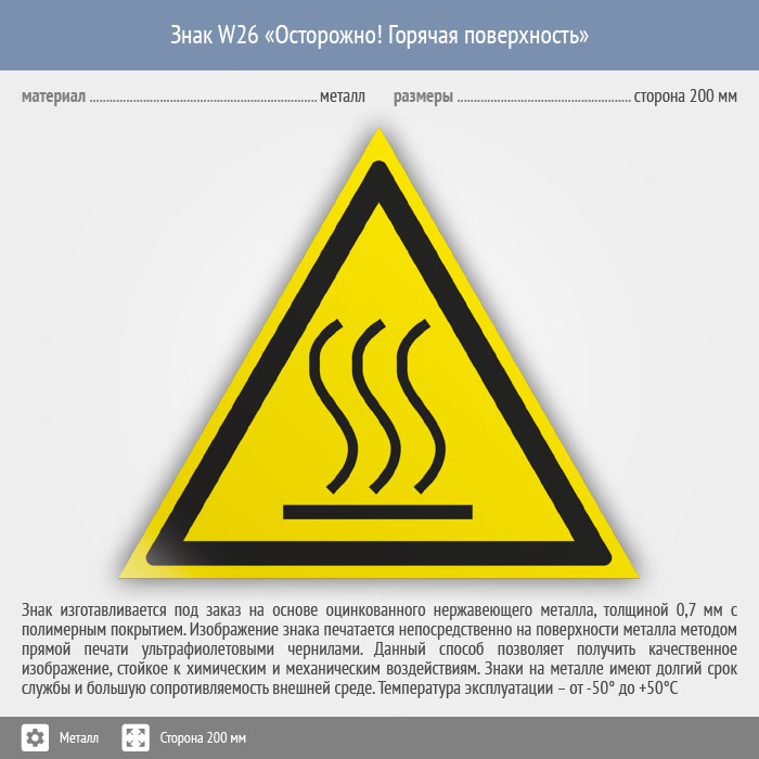Знак W26 «Осторожно! горячая поверхность» (металл, сторона 200 мм) в Кызыле купить