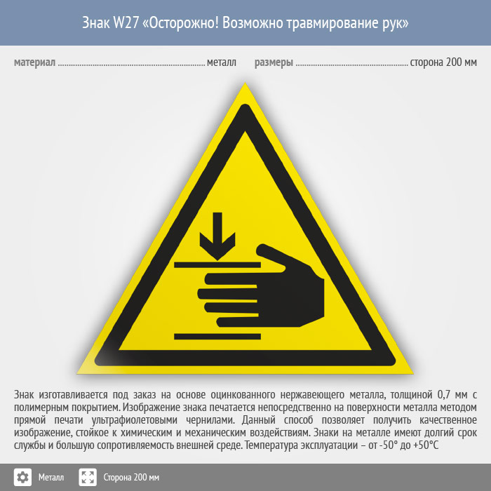 Знак W27 «Осторожно! возможно травмирование рук» (металл, сторона 200 мм) в Кызыле купить