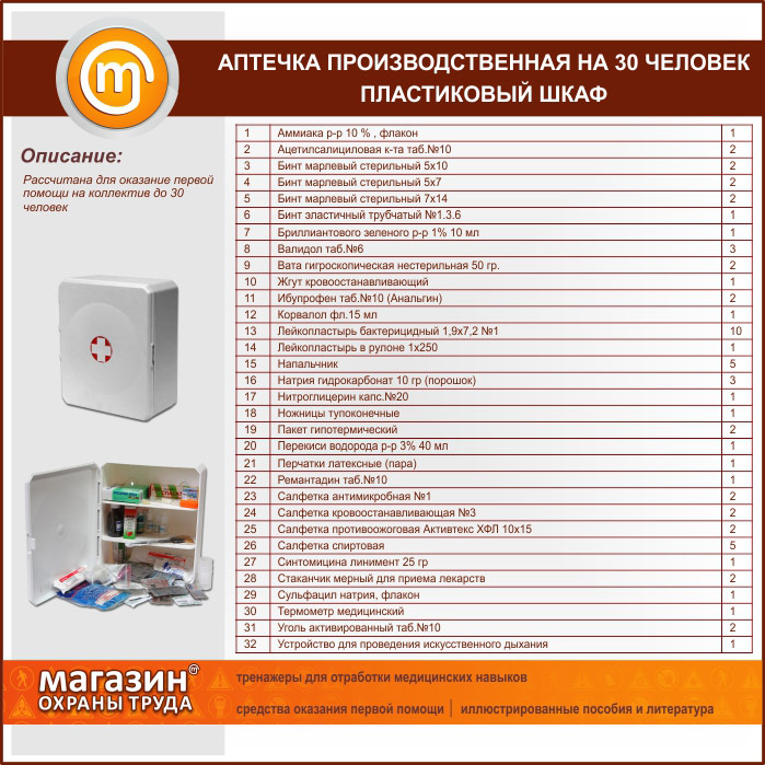 | Аптечка ПРОИЗВОДСТВЕННАЯ (до 30 человек) - пластиковый шкаф | Аптечка ПРОИЗВОДСТВЕННАЯ (до 30 человек) - пластиковый шкаф |