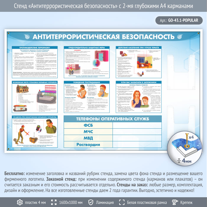 Стенд «Антитеррористическая безопасность» с 2-мя глубокими А4 карманами - это важнейшая информация о необходимых действиях по выявлению готовящегося теракта и о том, как себя вести в случае террористического акта