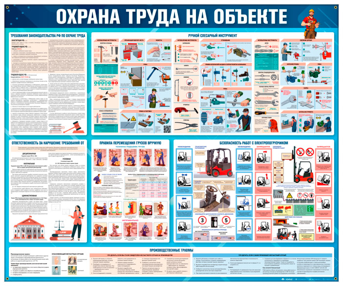 Стенд «Охрана труда на объекте» (OT-43) содержит практическую информацию по охране труда при выполнении работ на производственных объектах. На стенде представлены требования законодательства, ответственность за их нарушение, правила безопасного использования ручного слесарного инструмента, перемещения грузов вручную и работы с электропогрузчиком. Также раскрыты темы предупреждения производственных травм, оформления несчастных случаев и классификации происшествий. Стенд способствует повышению уровня производственной безопасности и профилактике нарушений на рабочих местах.