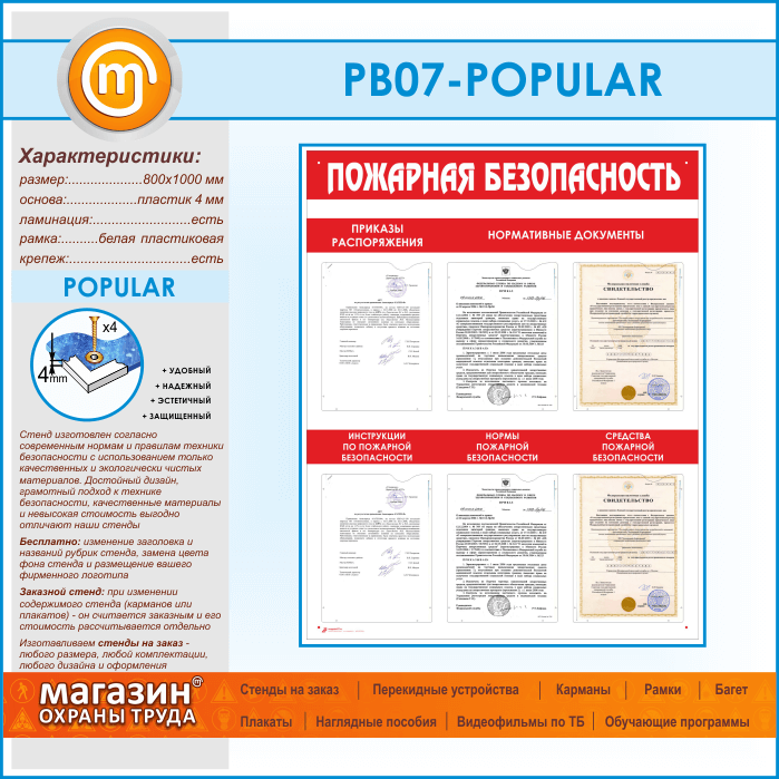 Стенд «Пожарная безопасность» – это небольшой уголок ПБ, подходящий для любого предприятия – на нем установлено 6 плоских карманов А4 формата для самостоятельного размещения информации под рубриками: приказы и распоряжения, нормативные документы, инструкции по пожарной безопасности, нормы пожарной безопасности, средства пожарной безопасности…