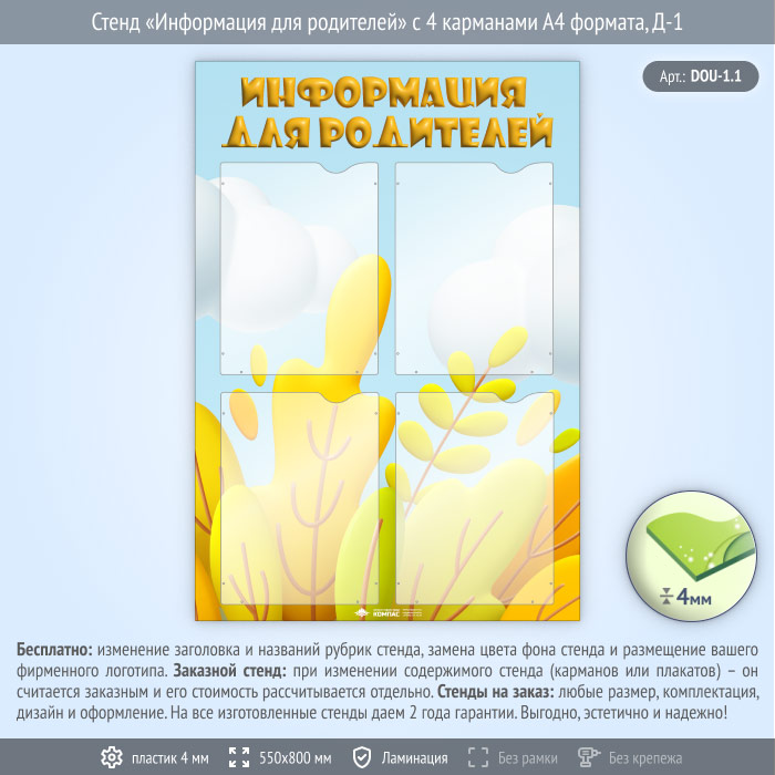 Стенд «Информация для родителей» с 4 карманами А4 формата (DOU-1.1) в Кызыле купить