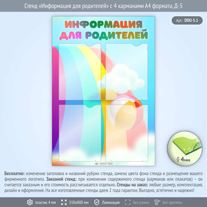 Стенд «Информация для родителей» с 4 карманами А4 формата (DOU-5.1) в Кызыле купить