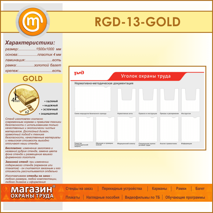 Стенд «Уголок охраны труда» с 1 плоским карманом А3 формата, 6 плоскими и 4 объемными карманами А4 формата (RGD-13-GOLD) в Кызыле купить