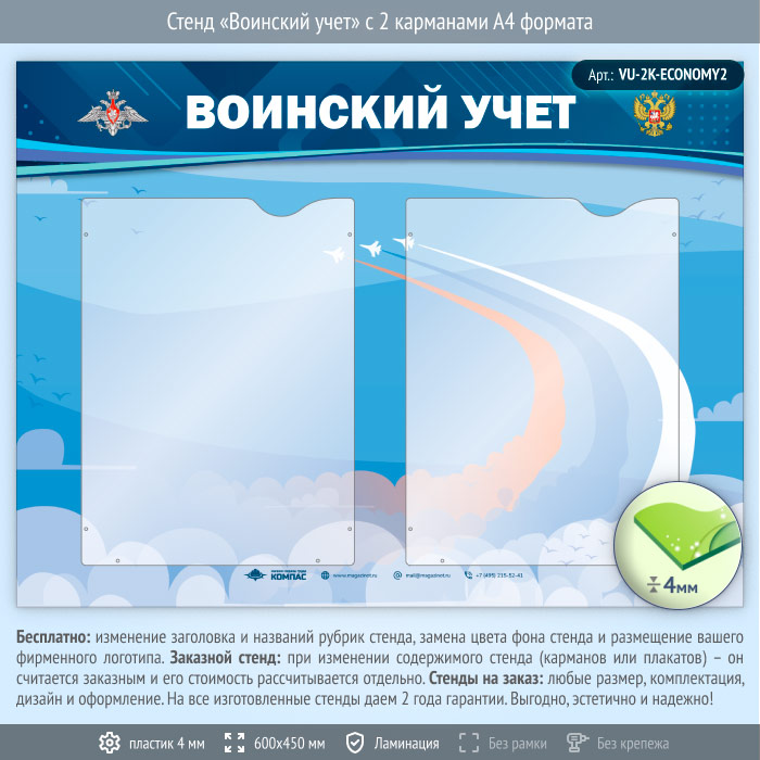 Стенд «Воинский учет» с 2 карманами А4 формата (VU-2K-ECONOMY2) в Кызыле купить