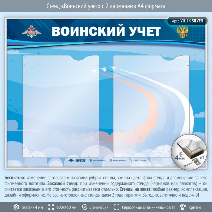 Стенд «Воинский учет» с 2 карманами А4 формата (VU-2K-SILVER) в Кызыле купить