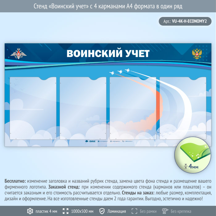 Стенд «Воинский учет» с 4 карманами А4 формата в один ряд (VU-4K-H-ECONOMY2) в Кызыле купить