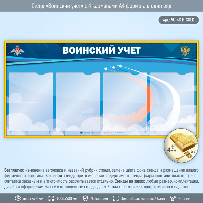 Стенд «Воинский учет» с 4 карманами А4 формата в один ряд (VU-4K-H-GOLD) в Кызыле купить