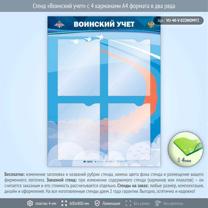 Стенд «Воинский учет» с 4 карманами А4 формата в два ряда (VU-4K-V-ECONOMY2) в Кызыле купить
