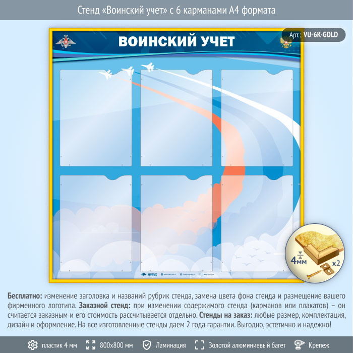 Стенд «Воинский учет» с 6 карманами А4 формата (VU-6K-GOLD) в Кызыле купить