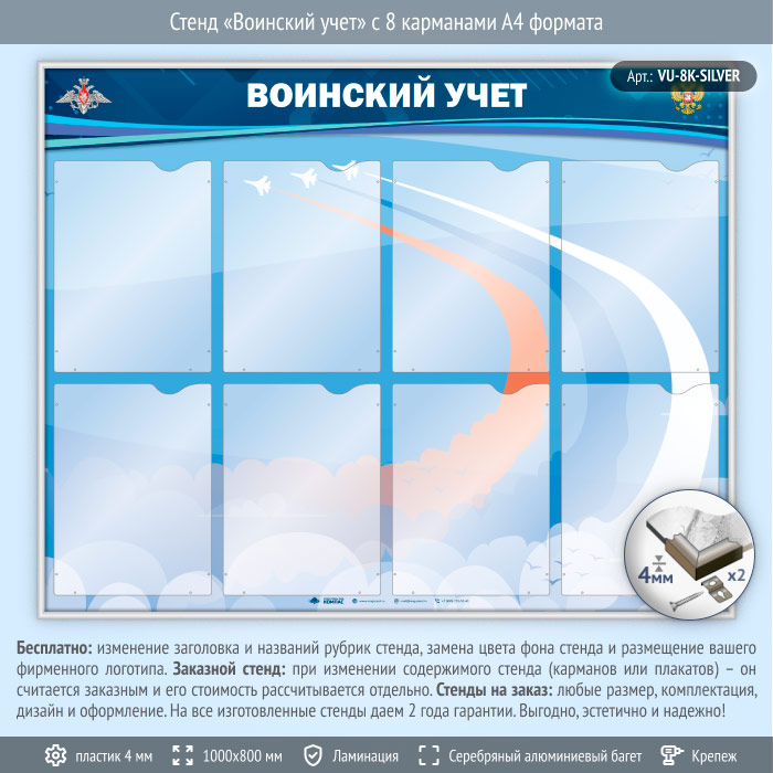Стенд «Воинский учет» с 8 карманами А4 формата (VU-8K-SILVER) в Кызыле купить