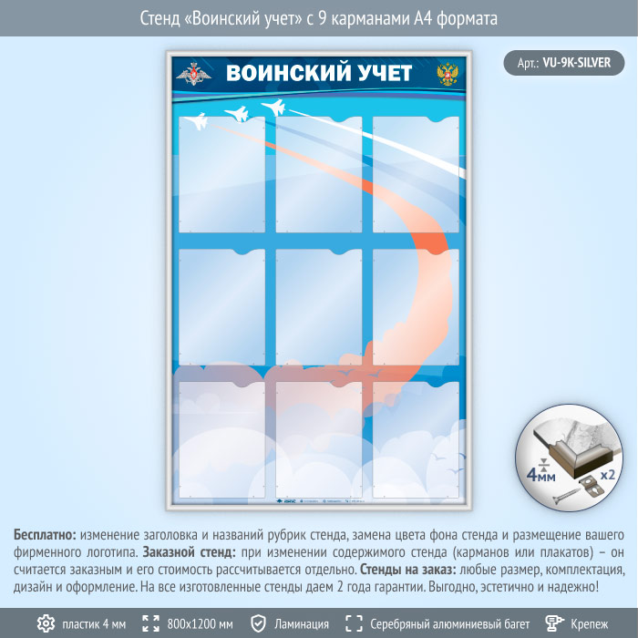 Стенд «Воинский учет» с 9 карманами А4 формата (VU-9K-SILVER) в Кызыле купить