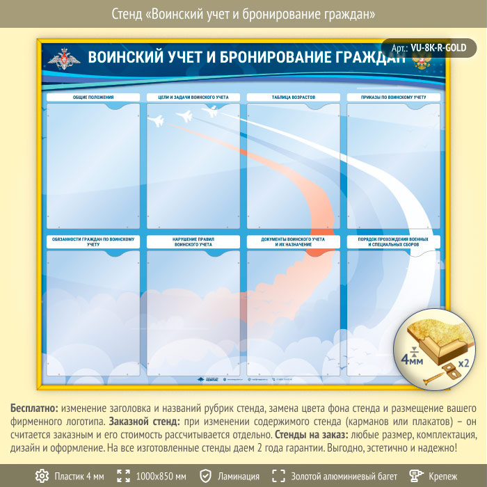 Стенд «Воинский учет и бронирование граждан» с 8 карманами А4 формата (VU-8K-R-GOLD) в Кызыле купить