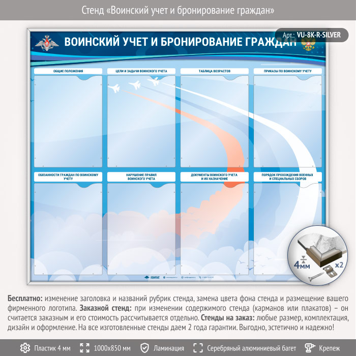 Стенд «Воинский учет и бронирование граждан» с 8 карманами А4 формата (VU-8K-R-SILVER) в Кызыле купить