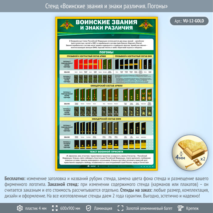 Стенд «Воинские звания и знаки различия. Погоны» (VU-12-GOLD) в Кызыле купить