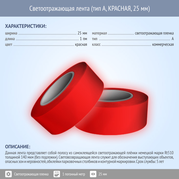 Светоотражающая однородная лента (тип А, КРАСНАЯ, 25 мм х 1 п.м.) в Кызыле купить
