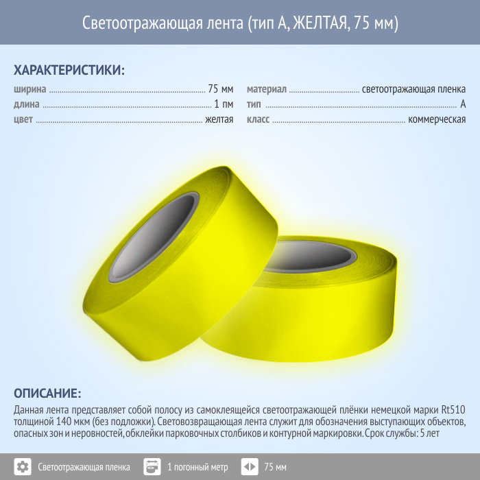 Светоотражающая однородная лента (тип А, ЖЕЛТАЯ, 75 мм х 1 п.м.) в Кызыле купить