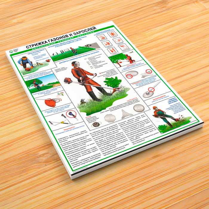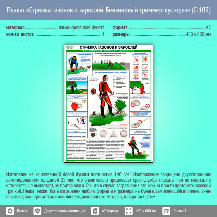Плакат «Стрижка газонов и зарослей. Бензиновый триммер-кусторез» (С-103, ламинированная бумага, А2, 1 лист) в Кызыле купить